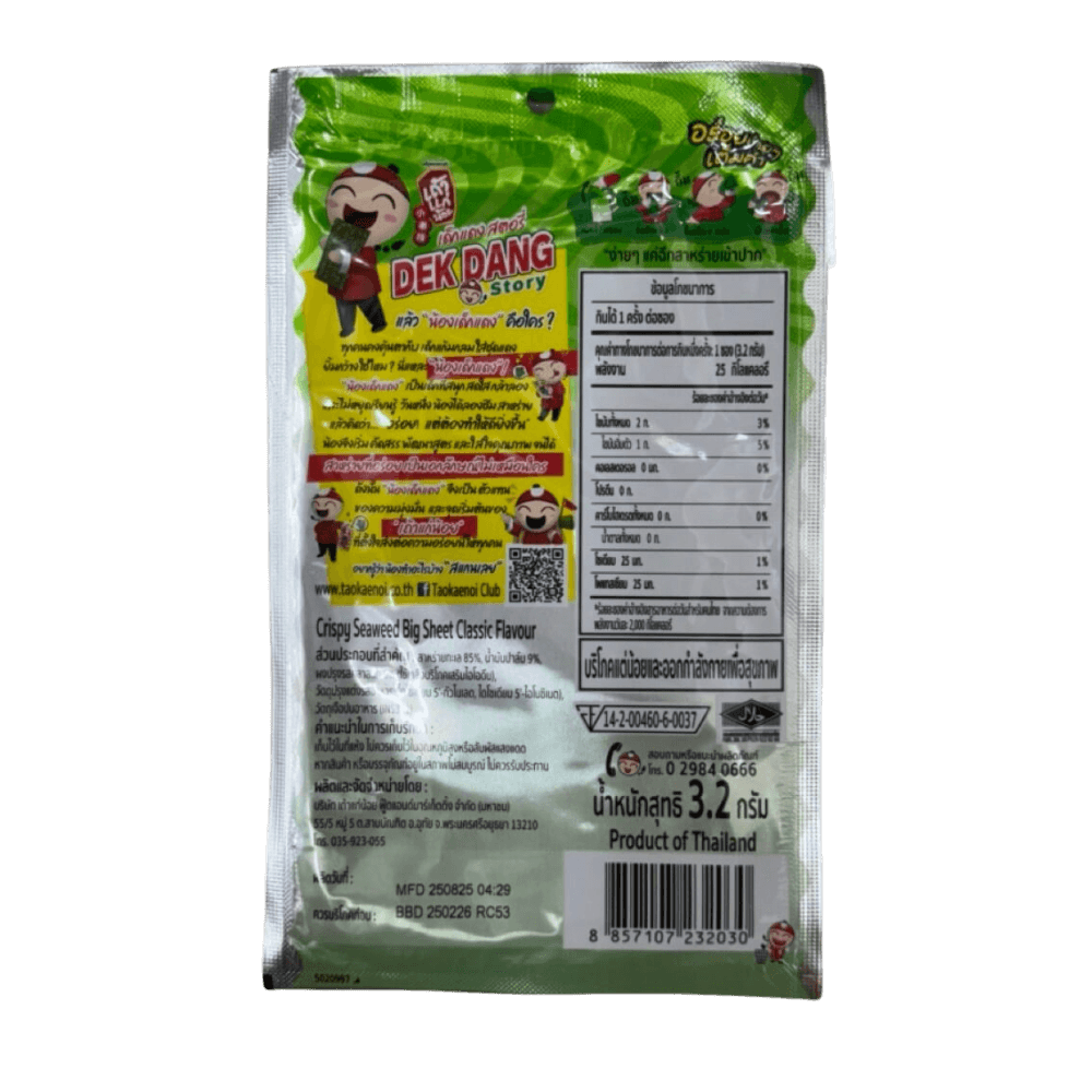 Découvrez le snack d’algue grillée Big Sheet, une collation légère et croustillante venue tout droit de Thaïlande. Préparé à partir d’algues marines de qualité, ce délice se décline en deux saveurs irrésistibles : classique, au goût naturellement salé, et pimenté, relevé d’une touche épicée pour les amateurs de sensations fortes. Riche en iode et pauvre en calories, ce snack convient aussi bien aux petites faims qu’à l’accompagnement de vos plats asiatiques préférés. À glisser dans votre sac pour une pause gourmande, saine et exotique à tout moment de la journée !